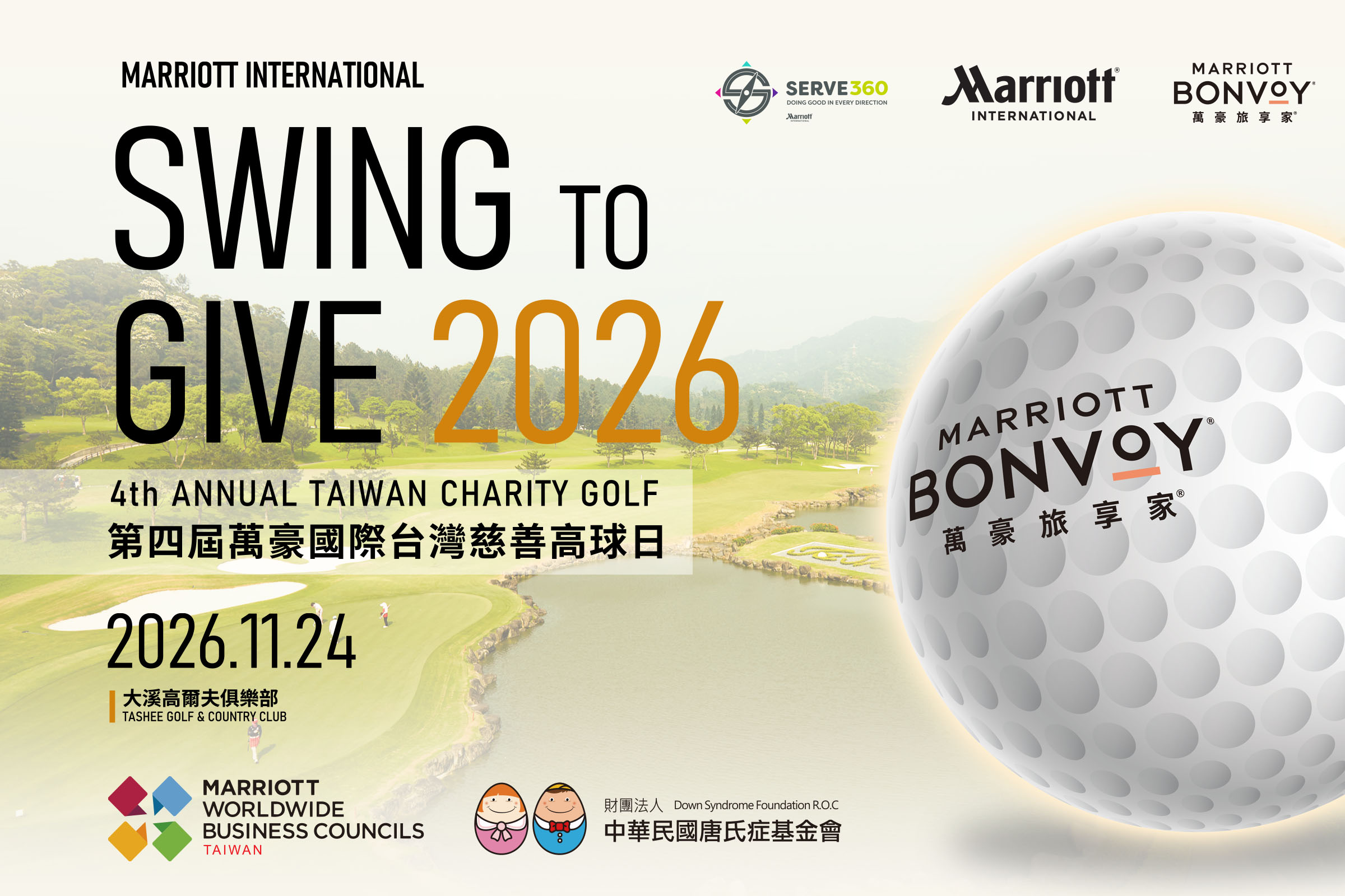 今年11月24日,萬豪結合集團在台灣32間飯店及度假村全體夥伴,誠摯邀請您參與「2026 第四屆萬豪國際台灣慈善高球日」,聯手各界菁英與產業意見領袖,共同以行動支持中華民國唐氏症基金會。您的每一次揮桿,都將轉化為守護唐寶寶的溫暖力量,與我們一同推動社會共好的永續願景。